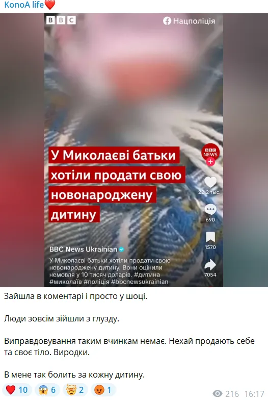 Нагадаємо, у Миколаєві поліція затримала 21-річну жінку та її 38-річного співмешканця, які намагалися продати свою новонароджену дитину за 10 тисяч доларів. Зловмисники планували реалізацію «угоди» ще під час вагітності, а отримані кошти збиралися витратити на власні потреби.
