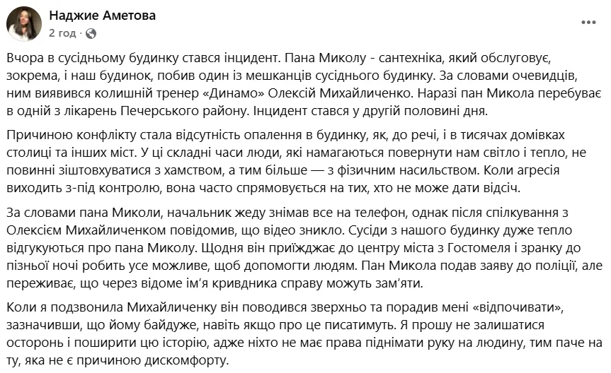 «Коли я подзвонила Михайличенку він поводився зверхньо та порадив мені «відпочивати», зазначивши, що йому байдуже, навіть якщо про це писатимуть. Я прошу не залишатися осторонь і поширити цю історію, адже ніхто не має права піднімати руку на людину, тим паче на ту, яка не є причиною дискомфорту», – написала журналістка.