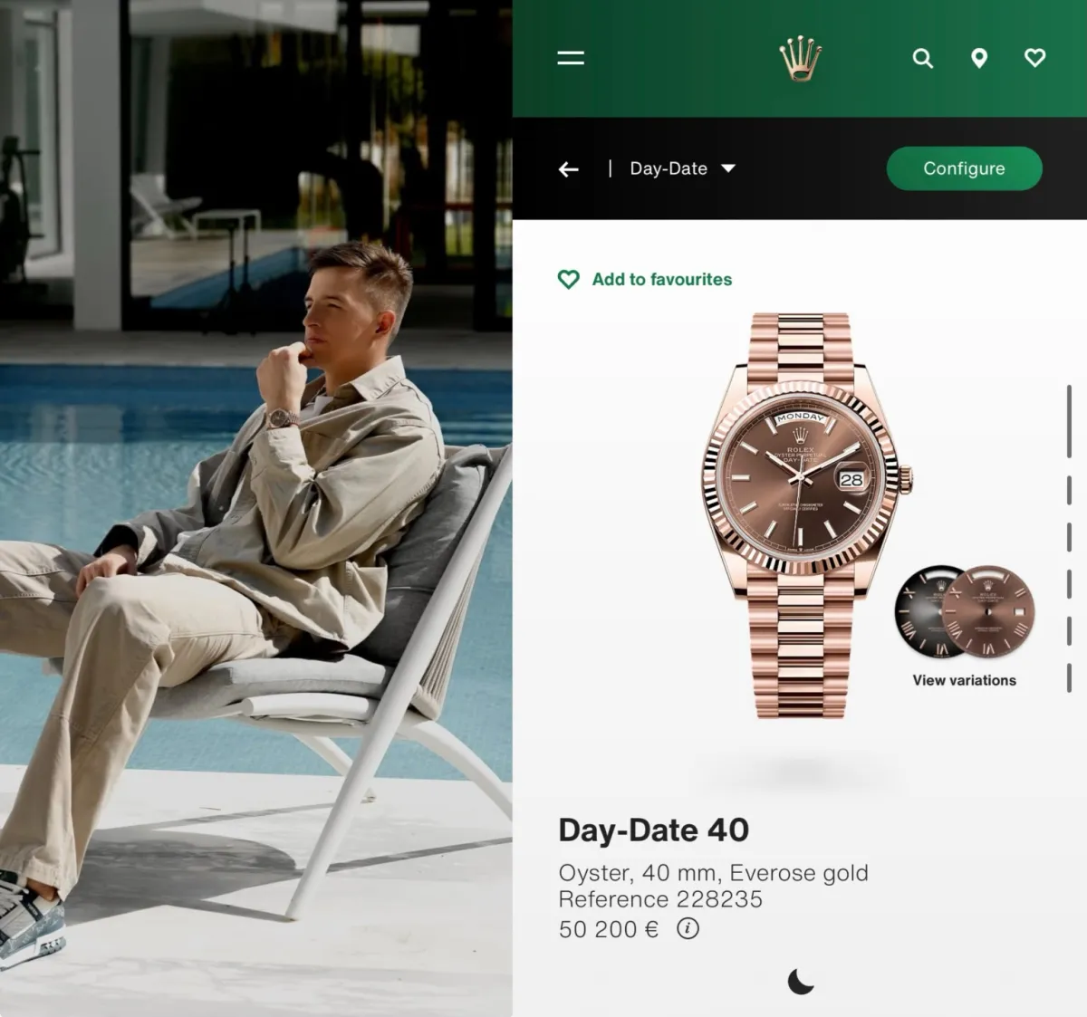 Його головний годинник — Rolex Day-Date 40 мм з рожевого золота, що коштує близько €50,200. Це розкішний аксесуар, який є символом статусу та вишуканості.