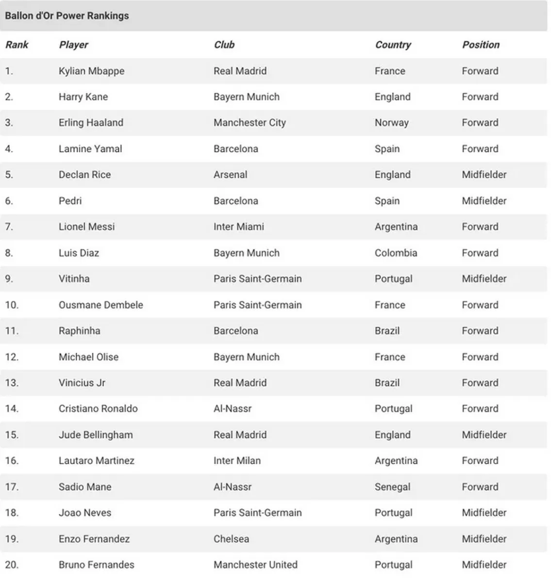 Друге місце посів Гаррі Кейн із «Баварії», який має 38 голів і 5 асистів у сезоні. Третім іде Ерлінг Голанд із «Манчестер Сіті», на рахунку якого 28 м’ячів у 36 матчах. До топ-10 також увійшли Ламінь Ямаль, Деклан Райс, Педрі, Ліонель Мессі, Луїс Діас, Вітінья та Усман Дембеле.