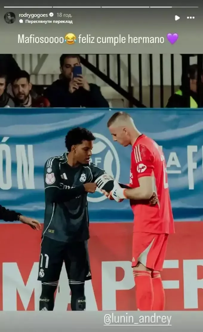 Воротар Реала та збірної України Андрій Лунін у свій 27-й день народження отримав жартівливе прізвисько від одноклубника Родріго. Бразилець опублікував сторіс із фото українця та підписом: