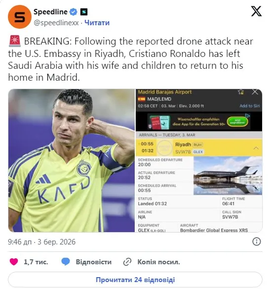 Нічна втеча від іранських ракет: Кріштіану Роналду на приватному літаку терміново покинув Ер-Ріяд