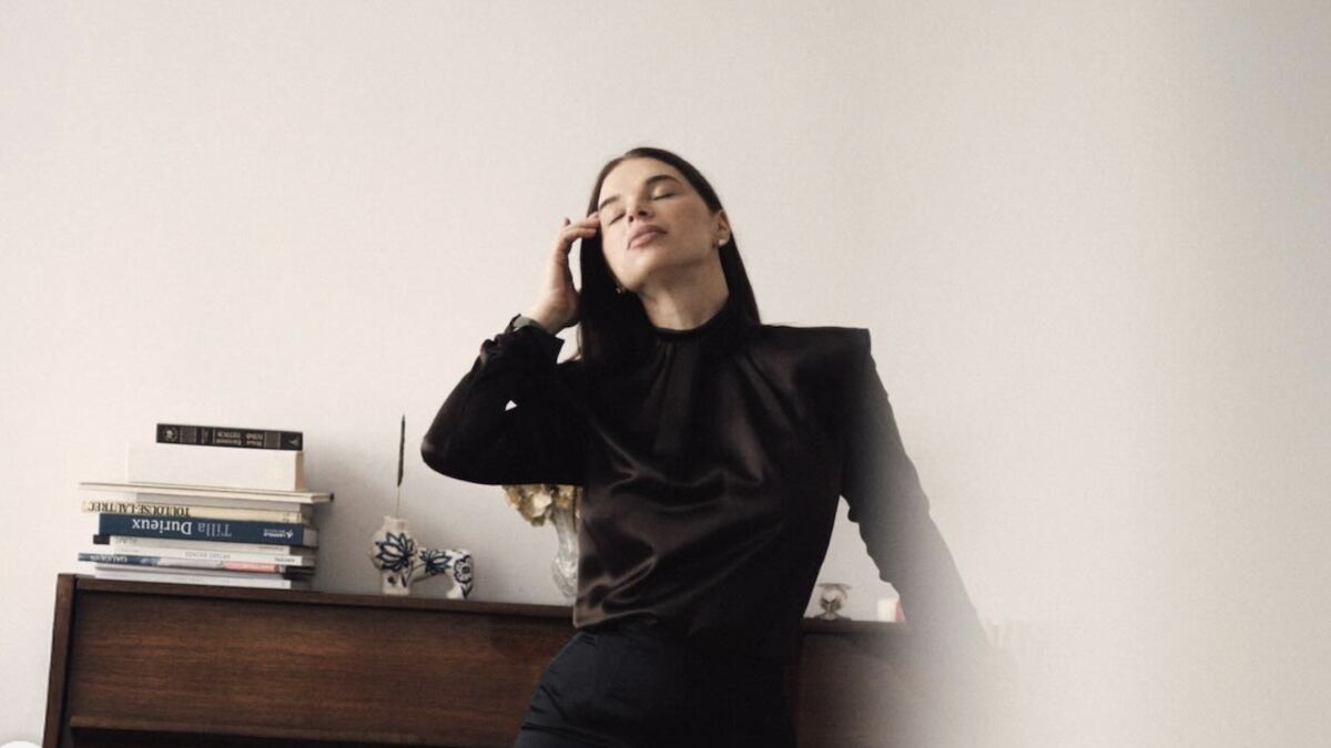 На знімках Катерина позує біля вінтажного піаніно у витонченому образі: шоколадна атласна блуза з довгими рукавами, чорна спідниця-олівець і туфлі на підборах.