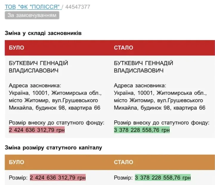 Якщо раніше він становив 2,424 млрд гривень, то після оновлення інформації – вже 3,378 млрд гривень. Таким чином, збільшення статутного капіталу клубу склало близько 954 мільйона гривень.