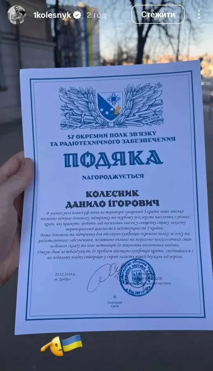 Колишній форвард другої команди Колоса з Ковалівки Данило Колесник, який став дуже «популярним» в Україні після побиття працівника ТЦК, похизувався грамотою від ЗСУ.
