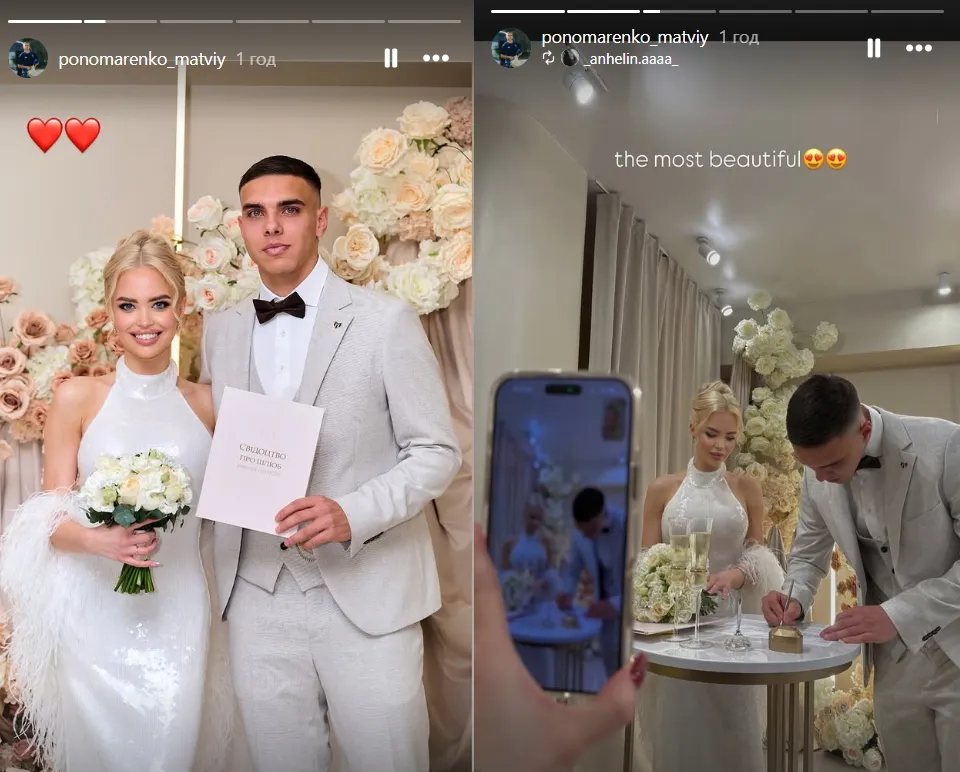 Матвій Пономаренко більше не є холостяком. 19-річний форвард Динамо та збірної України у четвер, 8 квітня опублікував у сторіс своєї сторінки в соціальній мережі Instagram фотографії з власного весілля, на яких він позує зі своєю обраницею.