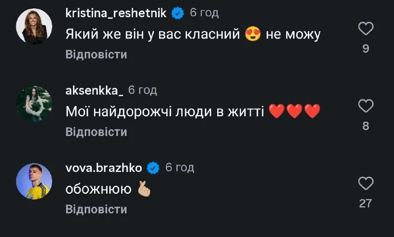 У коментарях зібралося багато знаменитостей, щоб наробити компліментів Даші та її сину. Під дописом можна помітити дружину Григорія Решетніка та коханого Квіткової Володимира Бражка, який залишив милий коментар.