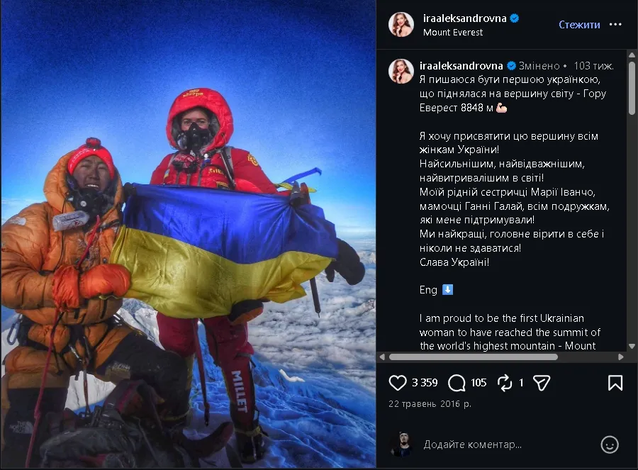 Символічно, що навесні минає 10 років відтоді, як Ірина стала першою українкою, що піднялася на Еверест – це сталося 20 травня 2016 року.
