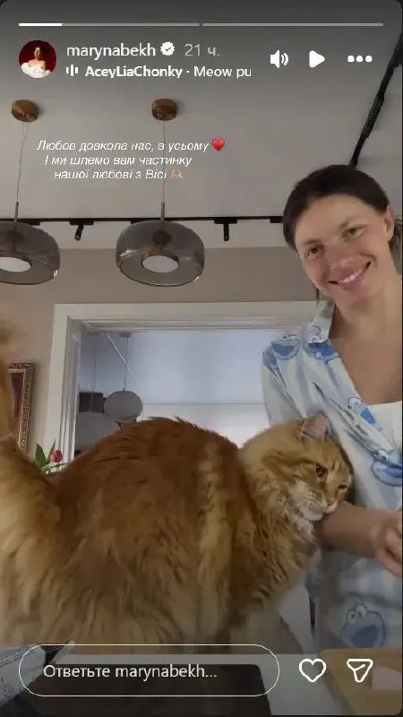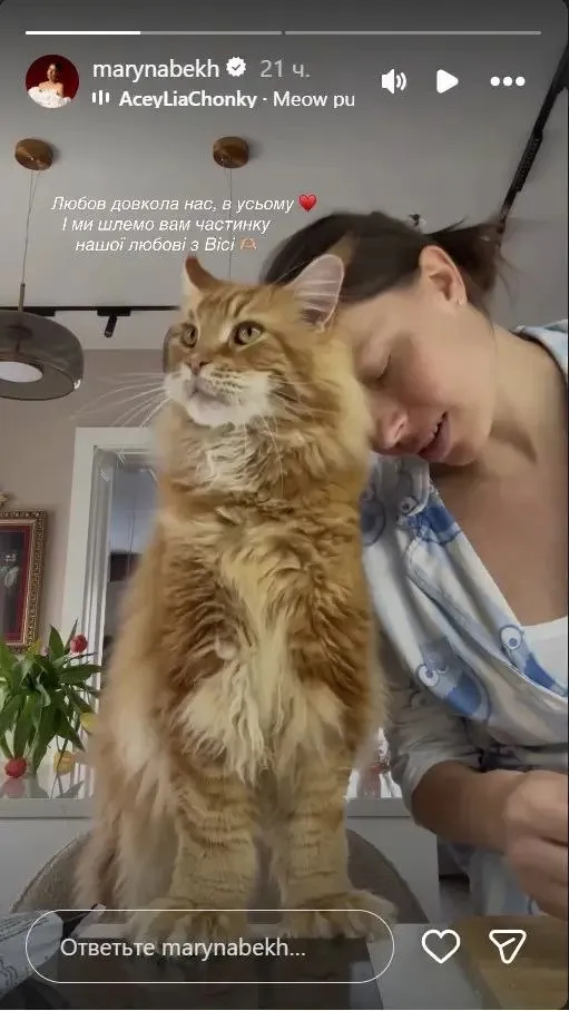 На опублікованому кадрі спортсменка з’явилася разом із домашнім улюбленцем на ім'я Вісі. Великий рудий кіт продемонстрував неабияку прихильність до своєї власниці та зворушливо тягнувся до неї головою. Марина не залишила такий милий момент без коментарів, звернувшись до своєї аудиторії з теплими словами.
