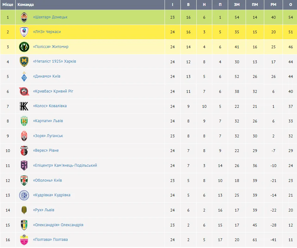 Турнірна таблиця УПЛ після 24-го туру: Шахтар відірвався від ЛНЗ, Динамо наблизилося до Полісся