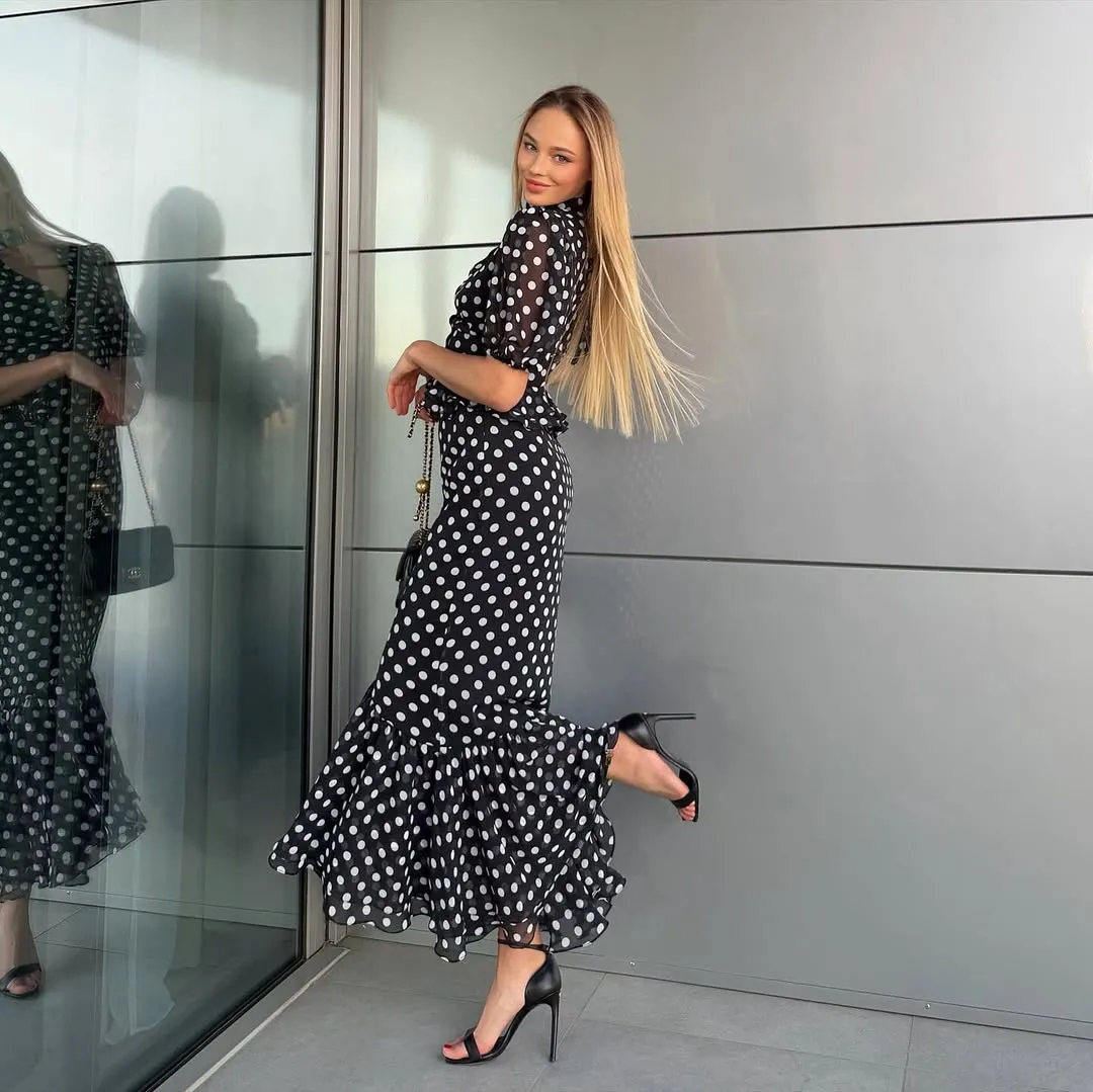 Дар’я Білодід опублікувала серію нових фото, де постала у стриманому total look – чорній сукні в горошок із легкими воланами та прозорими рукавами.
