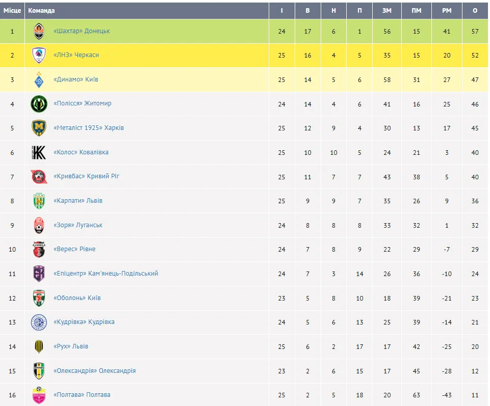 Турнірна таблиця УПЛ після матчу Кривбас – Динамо