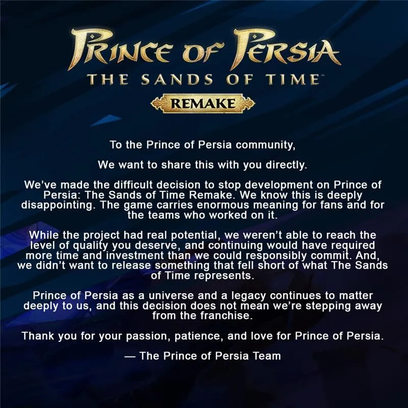 Ubisoft офіційно оголосила про припинення роботи над ремейком Prince of Persia: The Sands of Time, який перебував у розробці понад п’ять років. Про це компанія повідомила на офіційній сторінці франшизи у соцмережі X.