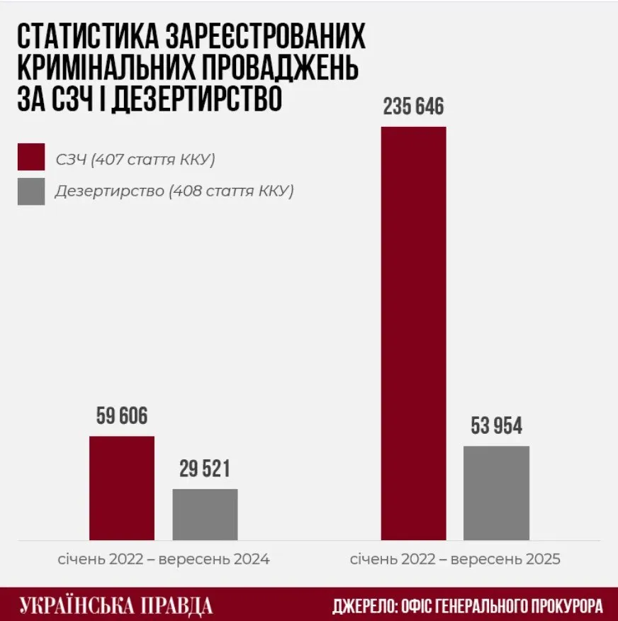 Від початку повномасштабного російського вторгнення до вересня 2025 року правоохоронці зареєстрували понад 289 тисяч кримінальних проваджень за статтями про самовільне залишення військової частини (СЗЧ) та дезертирство.