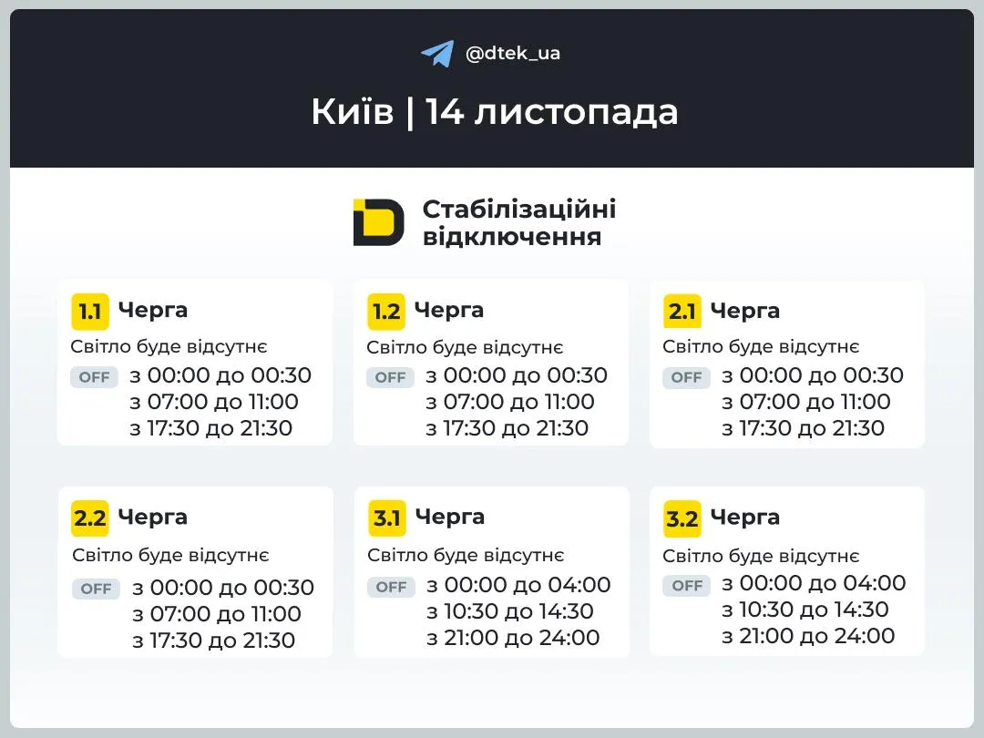 Завтра, 14 листопада, в останній робочий день тижня майже в усіх областях України графіки відключень будуть діяти 00:00 до 23:59. Їх обсяг сягатиме від 2 до 4 черг одночасно.