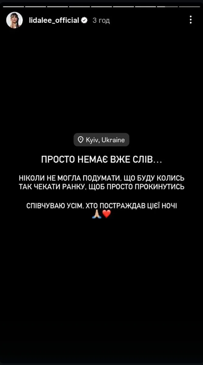 «ПРОСТО НЕМАЄ ВЖЕ СЛІВ... НІКОЛИ НЕ МОГЛА ПОДУМАТИ, ЩО БУДУ КОЛИСЬ ТАК ЧЕКАТИ РАНКУ, ЩОБ ПРОСТО ПРОКИНУТИСЬ. СПІВЧУВАЮ УСІМ, ХТО ПОСТРАЖДАВ ЦІЄЇ НОЧІ 🙏❤️», - емоційно зізналася співачка.
