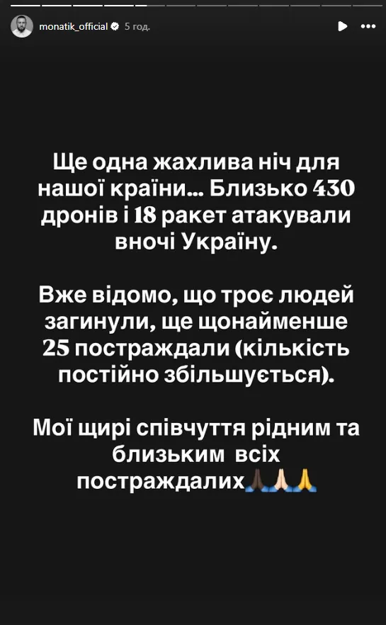 Український співак Монатік також звернувся до підписників, наголосивши на масштабі трагедії і висловив співчуття постраджалим.