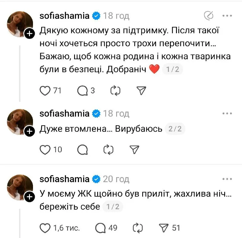«У моєму ЖК щойно був приліт, жахлива ніч… бережіть себе», – написала Софія Шамія.