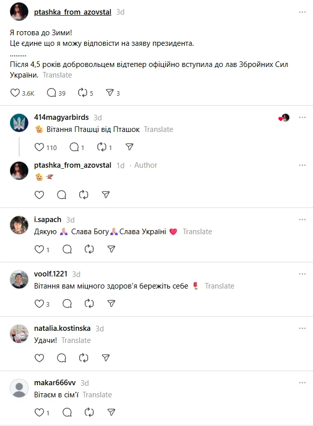 У коментарях «Пташку» активно підтримують за її вибір, дякують за незламність і бажають здоров’я.