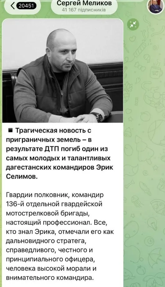 Інцидент стався за участі військових 88-ї бригади, які перебували у стані алкогольного сп'яніння. Про загибель високопоставленого офіцера вже офіційно повідомив очільник Дагестану Сергій Меліков, передає український журналіст Денис Казанський.