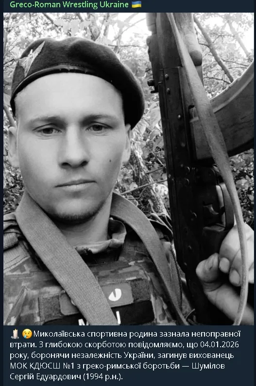 Миколаївська спортивна родина повідомила про загибель Сергія Шумілова — вихованця КДЮСШ №1 з греко-римської боротьби. Трагедія сталася 4 січня 2026 року під час виконання бойового завдання. Про це повідомили у телеграм каналі Greco-Roman Wrestling Ukraine.