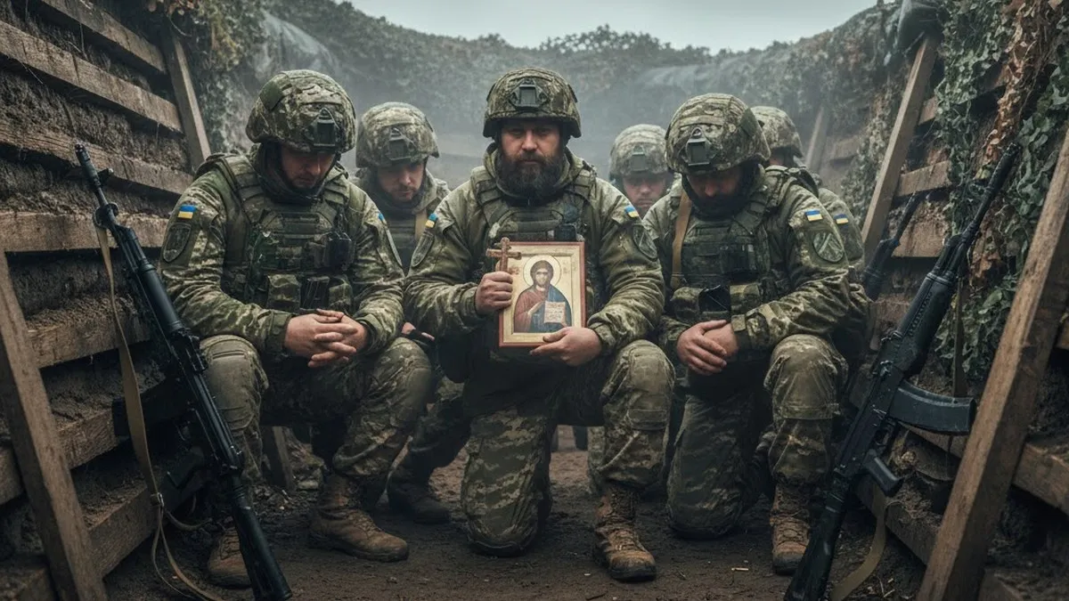 Військовослужбовці моляться перед боєм. Фото: BLIK.ua, згенероване засобами ШІ.