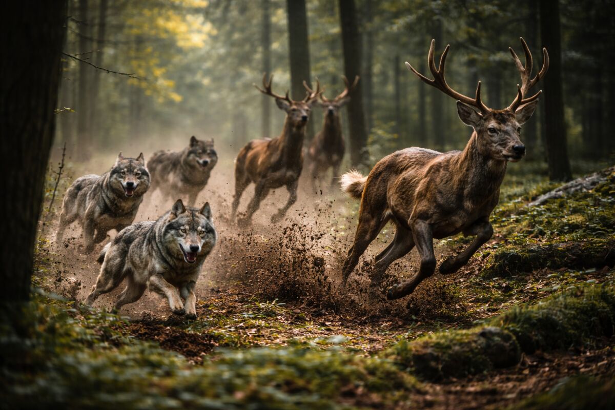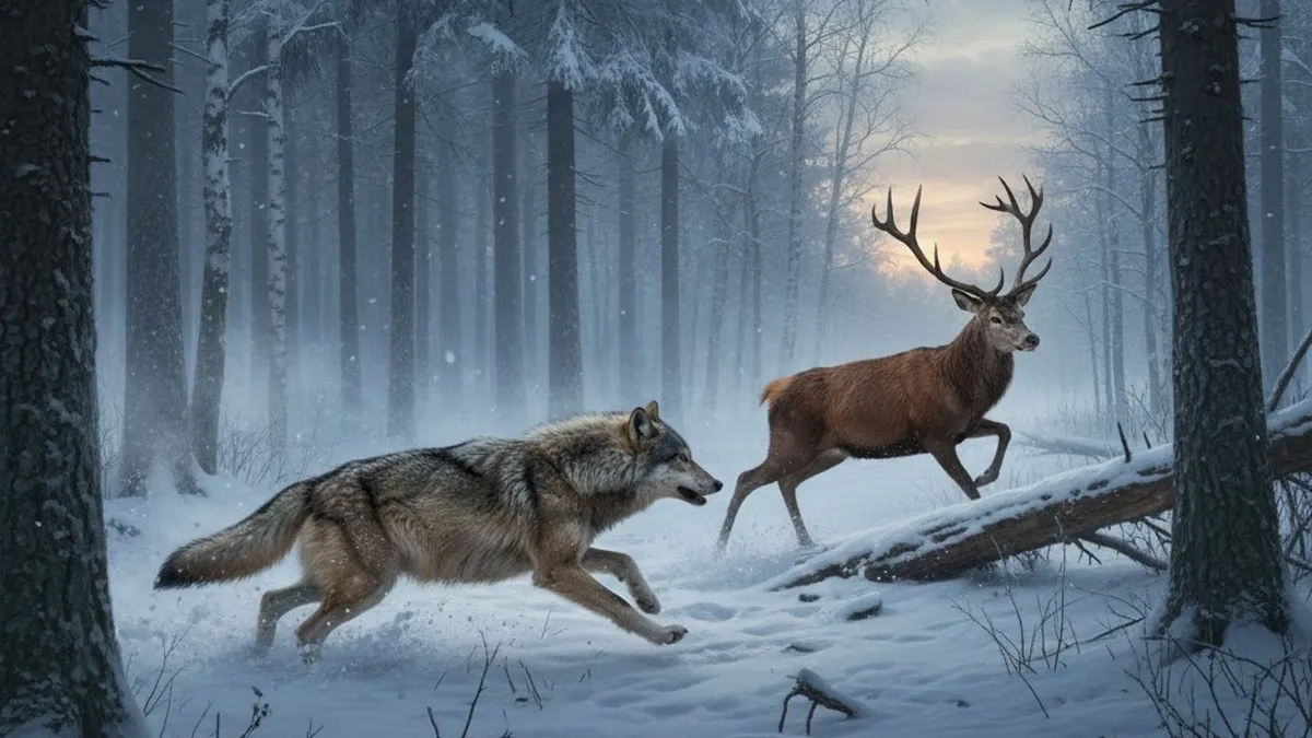 Вовк женеться за оленем. Фото: BLIK.ua, згенероване засобами ШІ