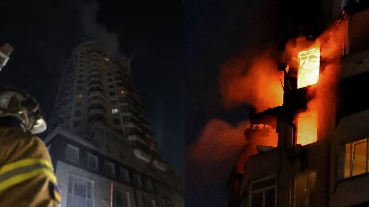 Влучання в багатоповерхівку у Києві. Фото: ДСНС