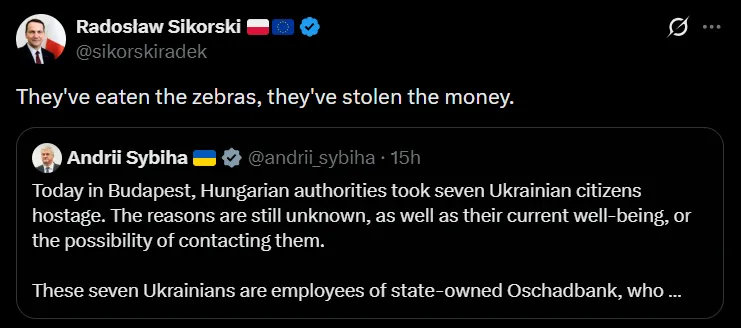 Польща різко відреагувала на затримання українських інкасаторів в Угорщині. Міністр закордонних справ країни Радослав Сікорський із сарказмом прокоментував ситуацію після заяв угорської влади на власній сторінці у мережі X. Він також поширив допис міністра закордонних справ України Андрія Сибіги, іронічно підписавши його словами: