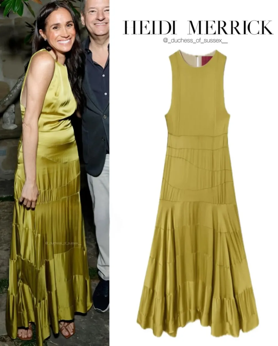 Меган обрала для події шовкову сукню «Gale» від бренду Heidi Merrick у відтінку шартрез – вартістю 715 доларів.