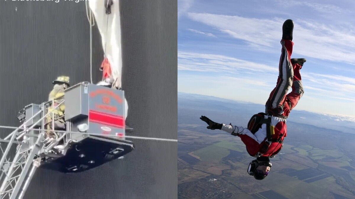 Watch as a parachuter becomes stuck on the scoreboard after a rough midair collision during a Virginia Tech… pic.twitter.com/iYqo4E1Chm